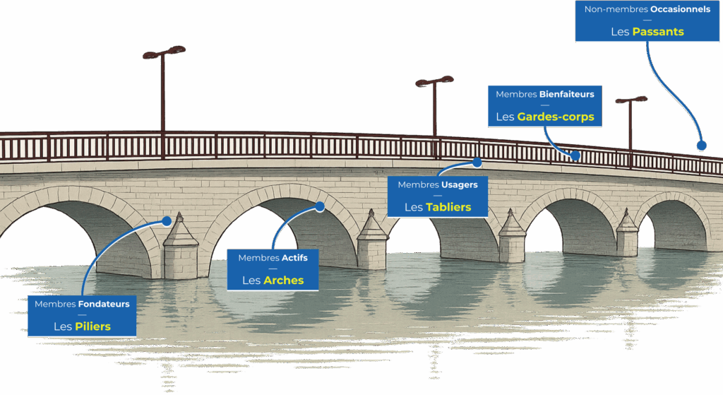 - Arches : les membres actifs qui soutiennent la structure au quotidien